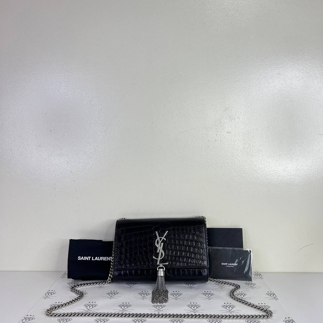 [PRE LOVED] YSL Small Kate Tassle in Black Croc Embossed Leather SHW