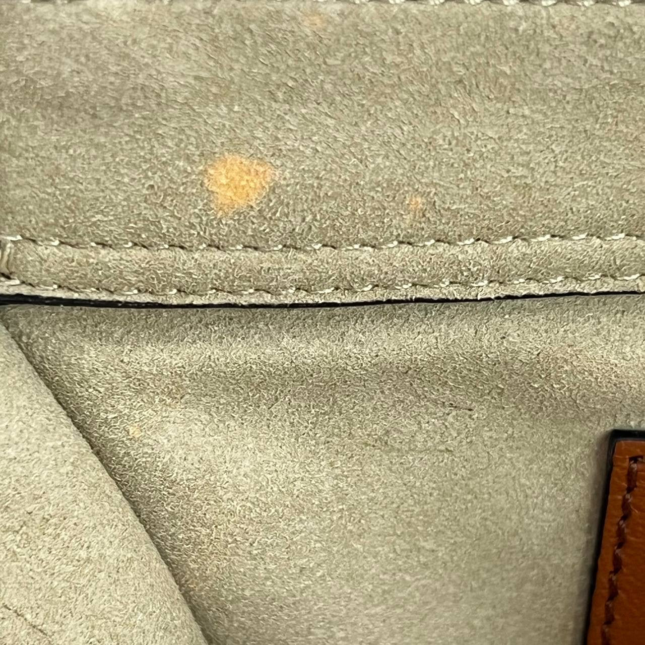 Flaw/s: dirt on the bottom and interior & minor tarnish on hardware