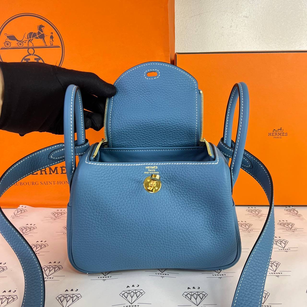 Hermes Mini Lindy in Blue Jean Clemence Leather GHW (Stamp B - 2023)