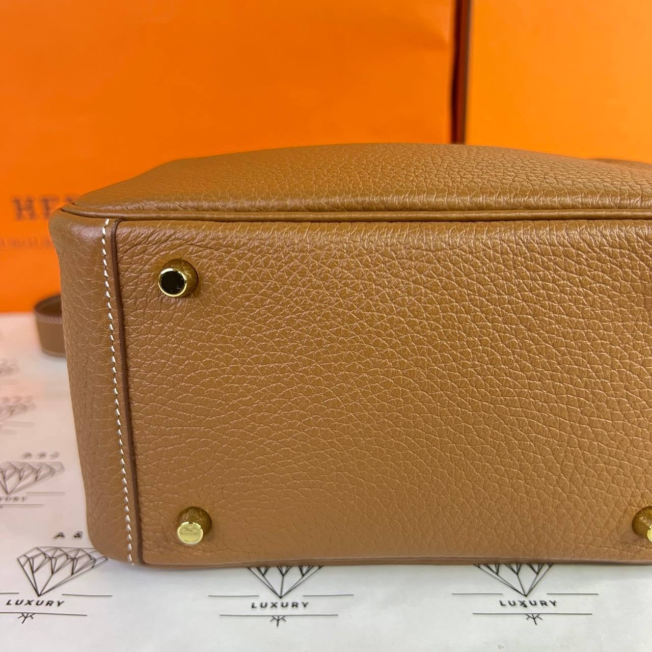 Flaw/s: inevitable hairline scratches on hardware & faint rub on one handle