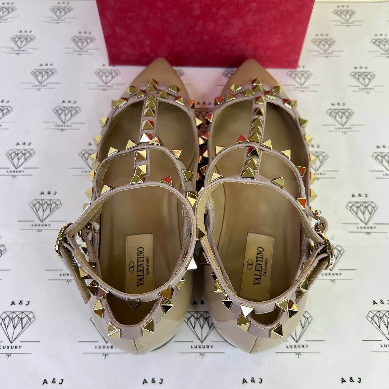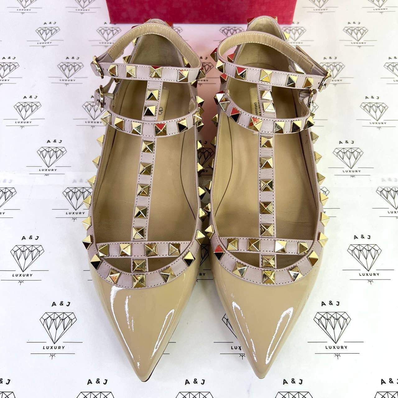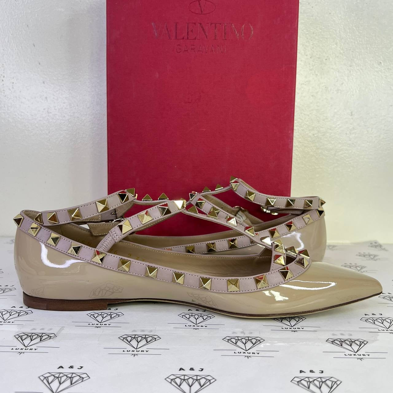 Valentino Rockstud Caged Flats in Beige Patent Leather Size 37.5EU